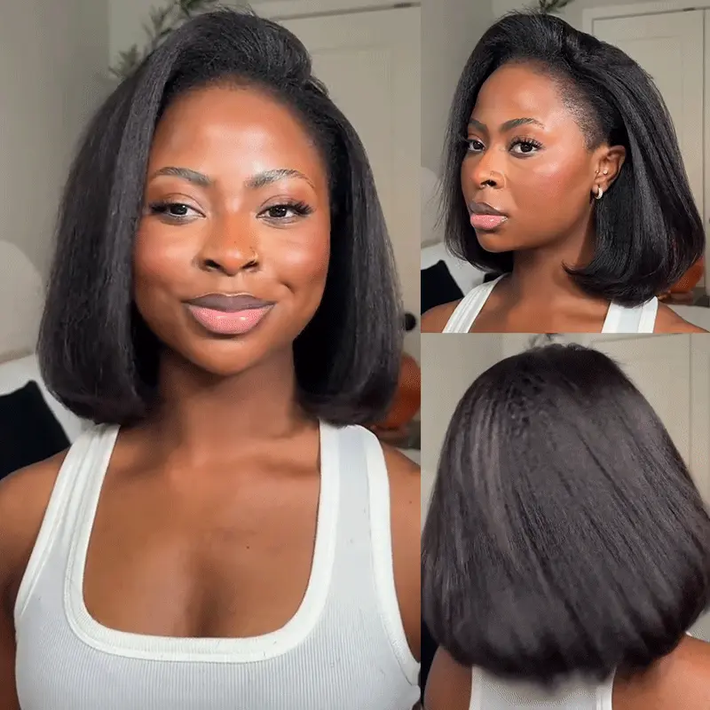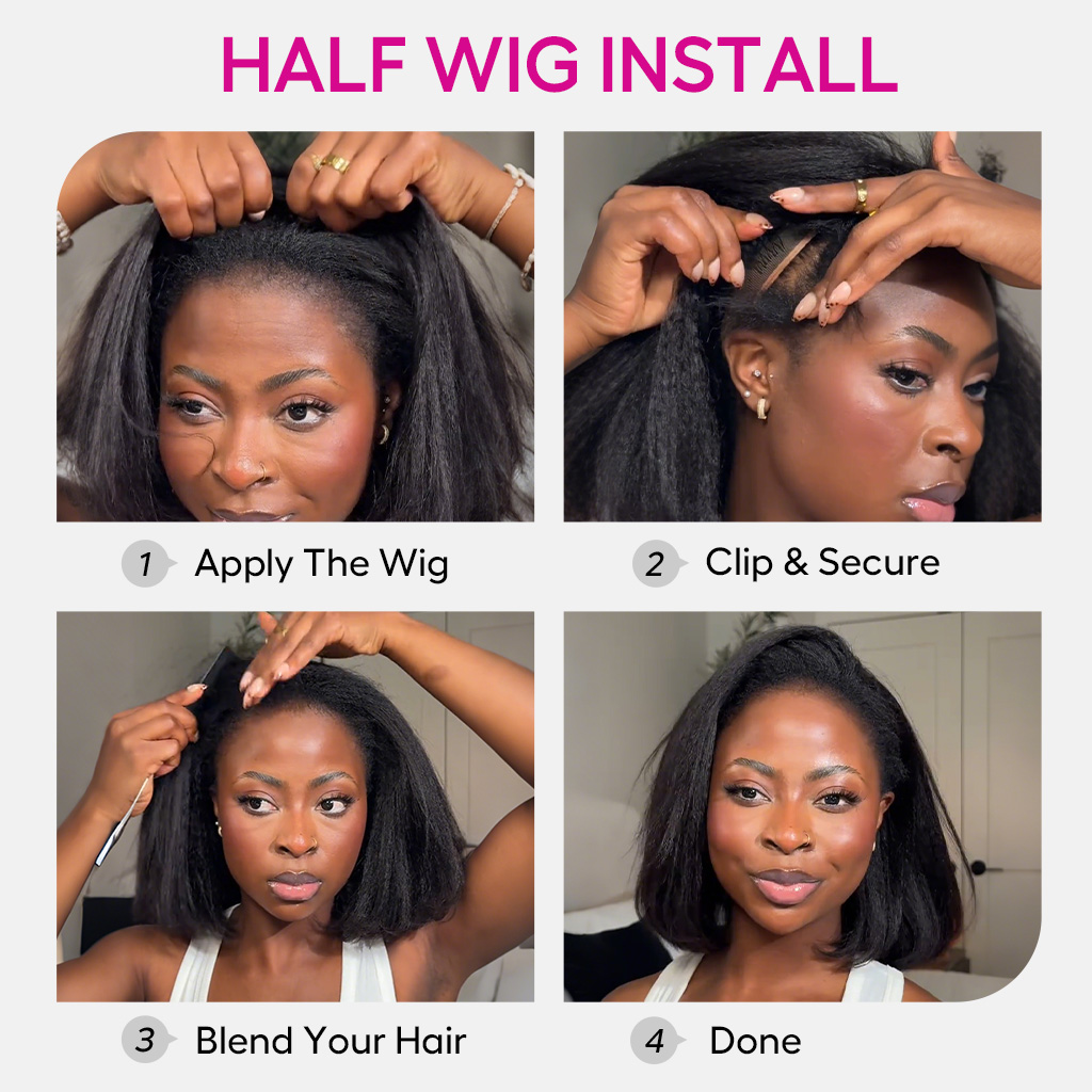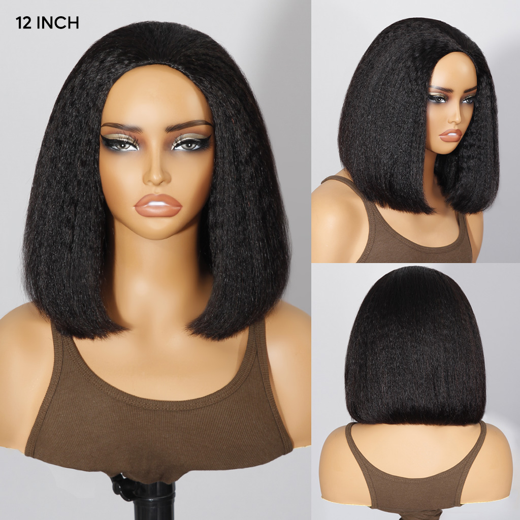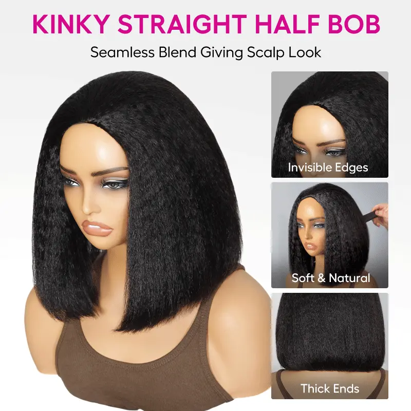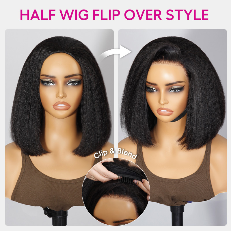 Kinky Straight Bob Half Wig Flip Over Human Hair Wig Seamless Blend Natural Hairline